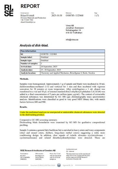 Våra diskblad har testats av Sveriges Forskningsinstitut för att säkerställa att de inte innehåller några oönskade ämnen.